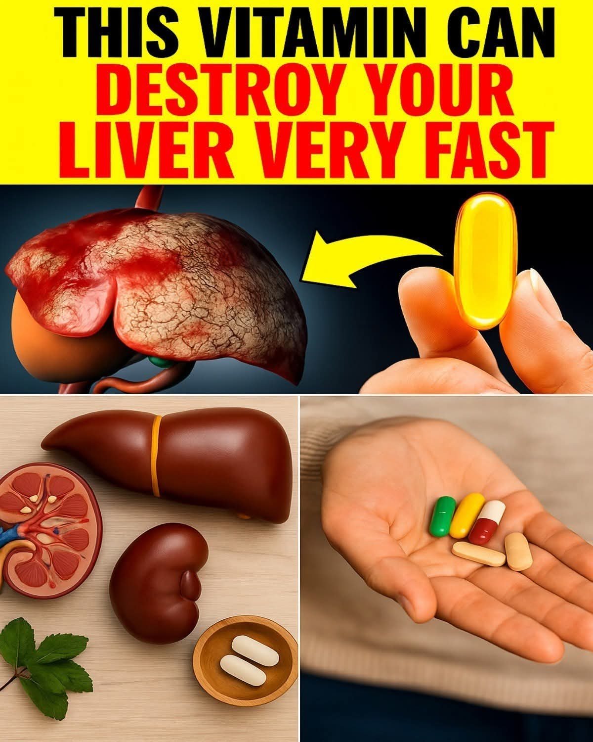 The eye‑catching image warns that a specific vitamin can cause rapid liver damage. Here’s a concise breakdown of the issue and the facts behind it: 1. The Vitamin in Question: The most common vitamin linked to liver toxicity when taken in excessive amounts is vitamin A (especially in its retinoid form). High doses of vitamin A can overwhelm the liver’s processing capacity, leading to acute or chronic liver injury. 2. How Liver Damage Occurs: The liver metabolizes vitamins and supplements. Overloading it with megadoses of certain fat‑soluble vitamins (A, D, E, K) can cause hepatotoxicity, inflammation, or fatty liver disease because these vitamins accumulate in liver tissue. 3. Symptoms to Watch For: – Nausea, vomiting, or abdominal pain. – Jaundice (yellowing of skin/eyes). – Elevated liver enzymes on blood tests. – Fatigue or weakness. 4. Prevention & Safe Use: – Stick to the recommended dietary allowance (RDA) of vitamin A (around 900 µg for men, 700 µg for women). – Prefer natural sources like carrots, sweet potatoes, or liver (in moderation). – Consult a healthcare professional before taking high‑dose supplements, especially if you have liver conditions. 5. What the Image Shows: The collage juxtaposes an unhealthy liver with a yellow vitamin capsule, implying the supplement’s potential harm. It also displays kidney models and various pills, hinting at broader organ risks from excessive supplementation. 6. Bottom Line: Vitamins are essential for health, but excess intake of fat‑soluble vitamins, particularly vitamin A, can indeed damage the liver quickly. Always follow dosage guidelines and seek medical advice for personalized supplementation. Tip: If you suspect vitamin toxicity or liver issues, get a medical evaluation and liver function test ASAP.