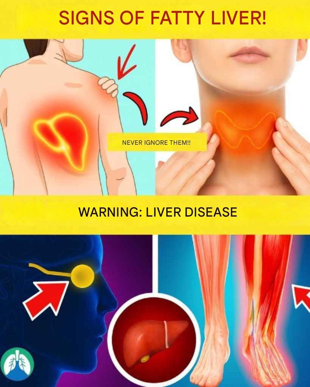 The image you shared highlights the warning signs of fatty liver disease, a condition where excess fat builds up in the liver cells. Here’s a concise article breaking down the visuals and the message they convey: What the picture shows1. Upper left panel: A person’s back with a glowing yellow-red liver outline and an arrow pointing to it, labeled “SIGNS OF FATTY LIVER!” The red glow indicates liver inflammation or damage. 2. Upper right panel: A person touching their neck/throat area with an orange highlighted thyroid/liver shape and the warning “NEVER IGNORE THEM!!” This suggests that symptoms can appear in the neck region (e.g., swelling or discomfort). 3. Bottom panel: Three illustrations – a silhouette with a yellow gallstone and red arrow (linking liver issues to bile problems), a close-up of a fatty liver with a yellow spot (fat accumulation), and legs with muscle/nerve pain indicating possible complications like weakness or cramping due to liver dysfunction. Key signs of fatty liver to watch for- Upper abdominal pain or discomfort (right side, near the liver). – Neck or throat swelling that may signal metabolic or hormonal imbalance linked to liver stress. – Fatigue & muscle weakness – the liver’s inability to detoxify can affect energy and muscles. – Visible liver enlargement or fat deposits (yellow spots) in the organ. Why you shouldn’t ignore these signsFatty liver can progress to steatosis, inflammation (steatohepatitis), fibrosis, or even cirrhosis if untreated. Early detection lets you make lifestyle changes – like improving diet, increasing physical activity, and reducing alcohol intake – that can reverse or halt the condition. What to do nextIf you experience any of the symptoms shown, consult a healthcare professional for: – Blood tests (liver function tests). – Imaging (ultrasound or FibroScan) to assess liver fat. – Personalized advice on diet and exercise. Bottom line: The image urges you to recognize the body’s warning signals of fatty liver and act promptly to protect your liver health.
