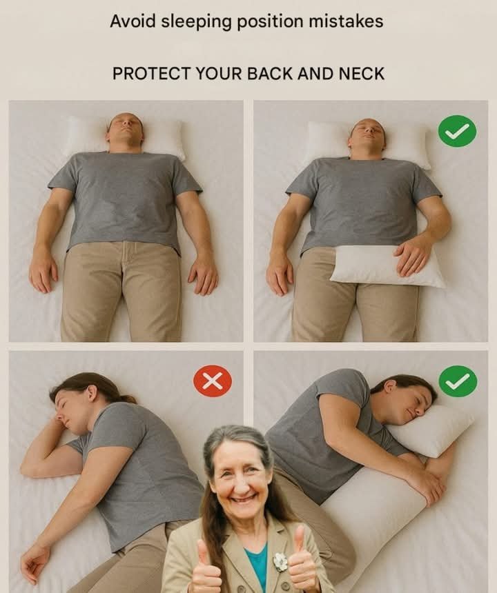 Sleeping Right: Protect Your Back and NeckThe image shows how sleeping positions can impact back and neck health. It highlights “right” and “wrong” ways to sleep for both back and side sleeping to minimize strain. Back Sleeping- Wrong: Lying flat without support can strain the neck. – Right: Placing a pillow under the knees (as shown with a green check) can help maintain spinal alignment. Side Sleeping- Wrong: Sleeping without proper neck support can lead to discomfort. – Right: Using a pillow between or under the head (shown with a green check) supports the neck and spine. Tips for PakistanIn Pakistan, where back and neck pain can be common due to various lifestyle factors, paying attention to sleeping positions can help. Choosing the right pillow and position can aid in better sleep and reduced pain. Bottom LineThe image emphasizes avoiding sleeping position mistakes to protect back and neck health. Adjusting how you sleep based on these tips can lead to better rest and less discomfort.