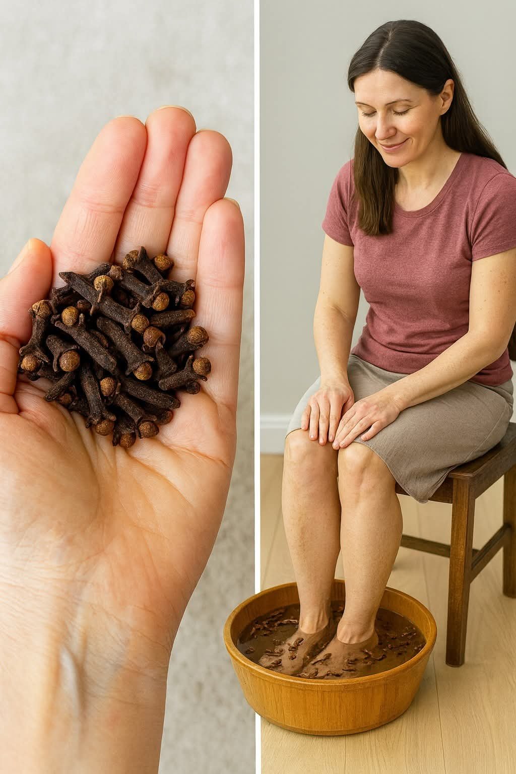 On the other side of the image, a woman is seen soaking her feet in a wooden bowl filled with water infused with cloves. This practice speaks to the use of cloves in aromatherapy and natural remedies for relaxation and pain relief. Soaking feet in a clove-infused bath can be a soothing experience, potentially helping to ease foot pain, reduce stress, and promote a sense of calm. The aroma of cloves can also contribute to a meditative atmosphere, enhancing the overall experience of relaxation.