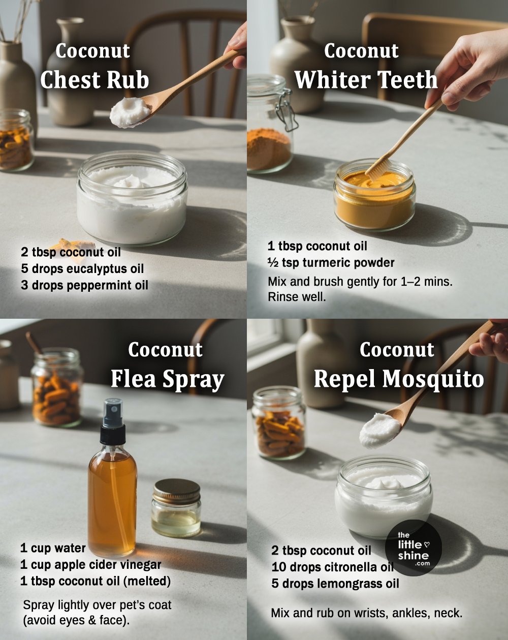 6. Mosquito repellent –  Mix a tablespoon of coconut oil with a couple of drops of peppermint, rosemary and tea tree oil to repel flies, mosquitos, gnats and bees. This is a safe alternative to DEET and can be applied safely on all areas of the body.