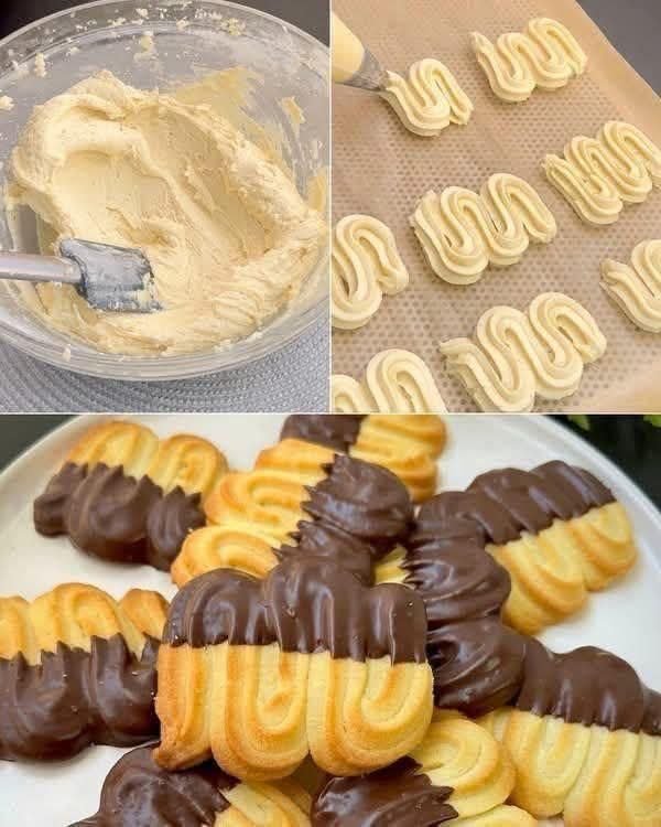 The collage shows the step‑by‑step journey of making classic butter biscuits finished with a glossy chocolate dip. Here’s how you can recreate them in your kitchen.