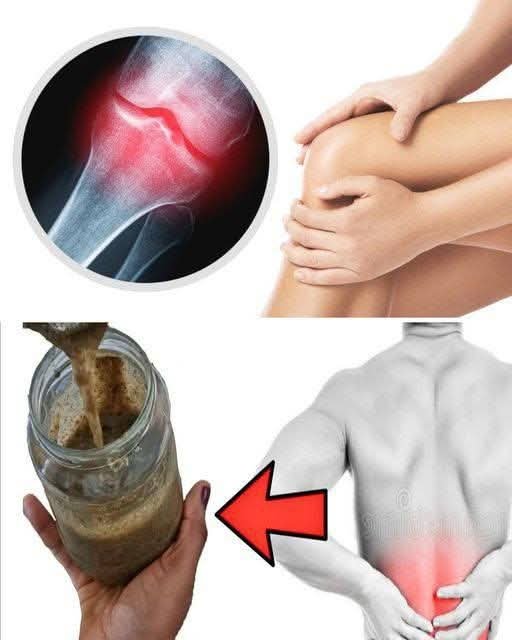 The pictures suggest a homemade mixture (likely a herbal paste or tonic in the glass jar) that is promoted as a natural treatment for two common issues: knee joint pain and stomach pain.