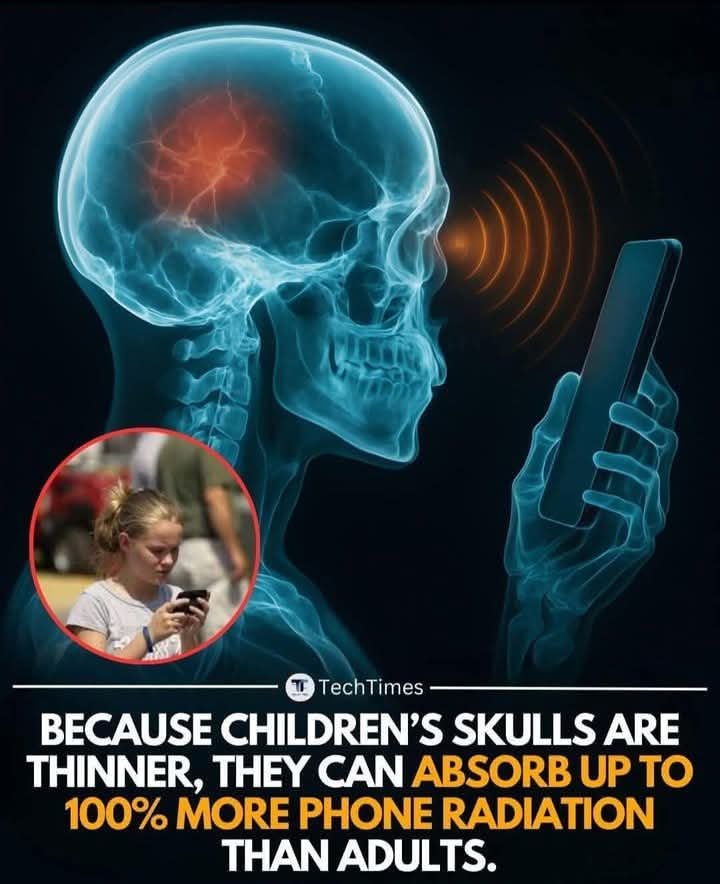 Children’s Skulls and Phone Radiation: What You Need to KnowA recent graphic from TechTimes highlights a crucial point about children’s exposure to phone radiation. The image depicts a skeletal head holding a phone, with a red glow indicating radiation absorption in the brain. It emphasizes that because children’s skulls are thinner, they can absorb up to 100% more phone radiation than adults.
