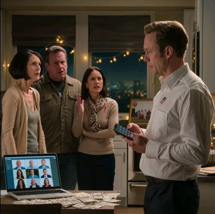 The photo captures a tense moment in a cozy home setting at night, illuminated by string lights in the background windows. A man in a white shirt stands holding a smartphone, facing three other adults who appear shocked or concerned. On the table in front of them lies an open laptop displaying a video call with several people, alongside scattered piles of cash and papers. A framed family photograph sits on a cabinet behind them, adding a personal context to the scene.