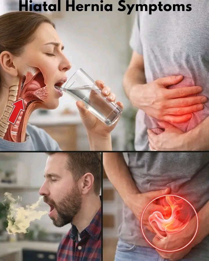 1. Heartburn & Acid Reflux: Stomach acid backs up into the esophagus, causing a burning sensation (as shown in the woman drinking water with an arrow indicating esophageal irritation).
