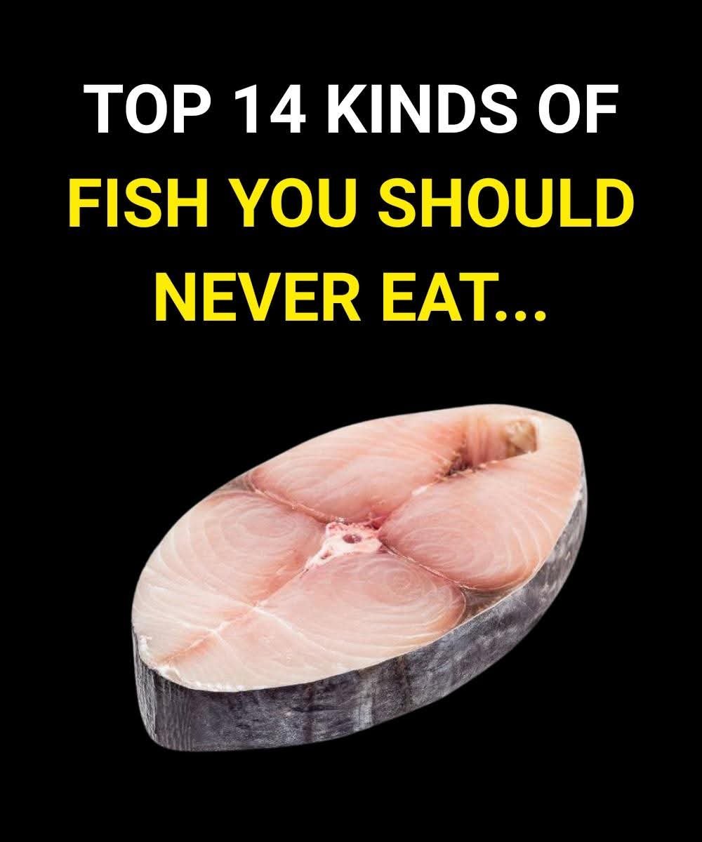 The image shouts “TOP 14 KINDS OF FISH YOU SHOULD NEVER EAT…” with a big slice of raw fish on a black background, warning you about risky seafood choices. Here’s a straight‑to‑the‑point article explaining which fish to avoid and the reasons behind the warning.