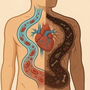Clogged Arteries (Right Side)- *Blocked Pathway*: The dark brown artery is filled with various debris, suggesting restricted blood flow.