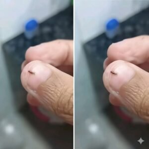 The two‑panel photo shows a thumb holding a tiny tick that has embedded itself in the skin near the nail. The left image captures the tick clearly, while the right image shows the same spot after the tick has been removed, leaving a small wound.